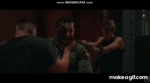 REV-9 splits between Sarah Connors shot gun blast as she fires.