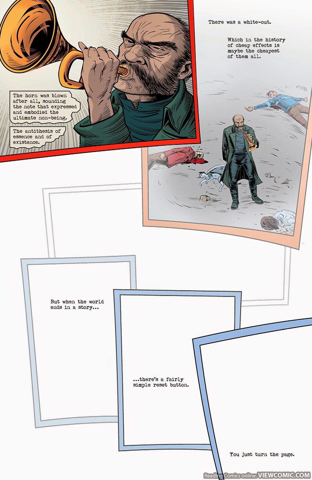 The world ends when the words stop. Each story is written on a page. A unwritten page is space of non-being where concepts don't exist, it is just nothing